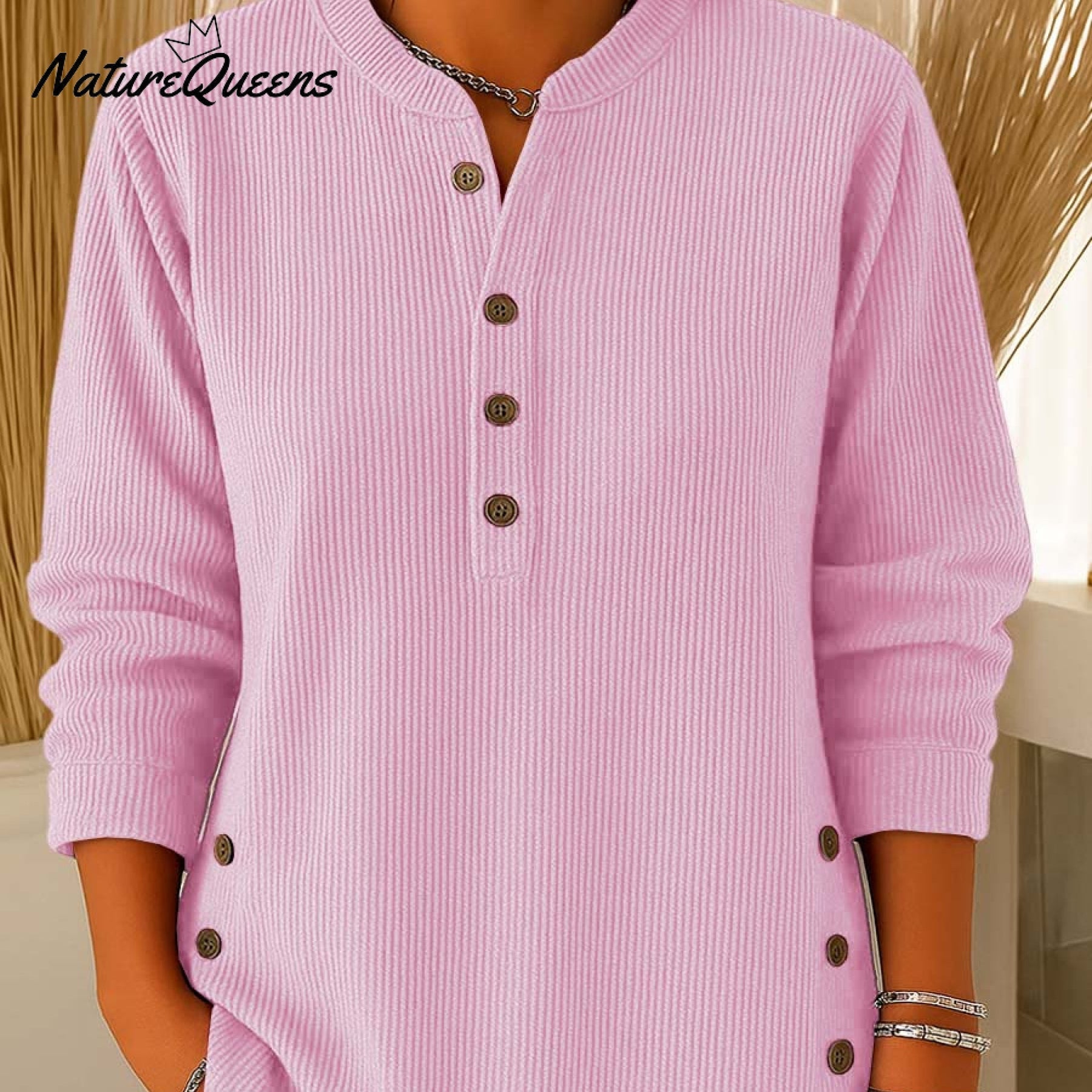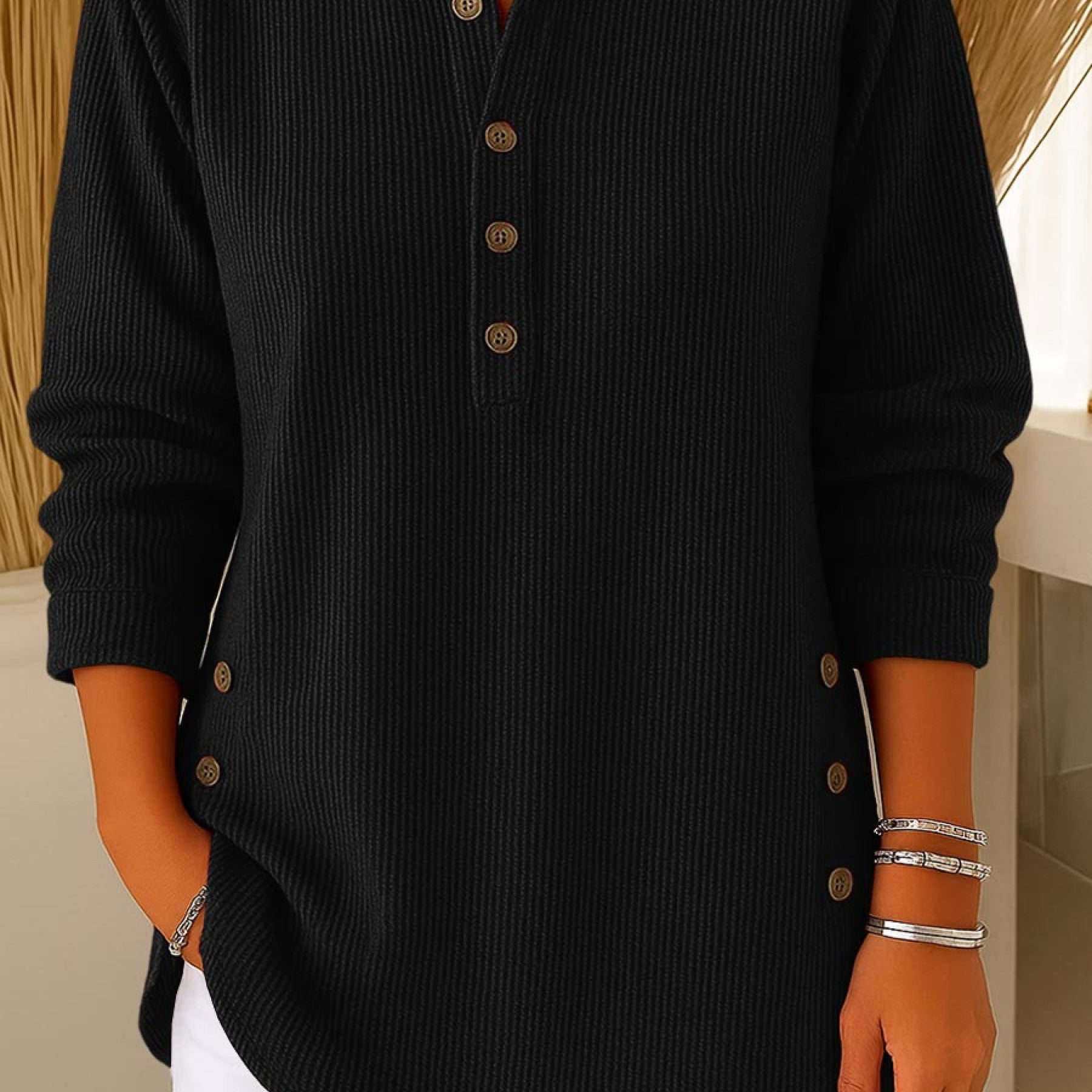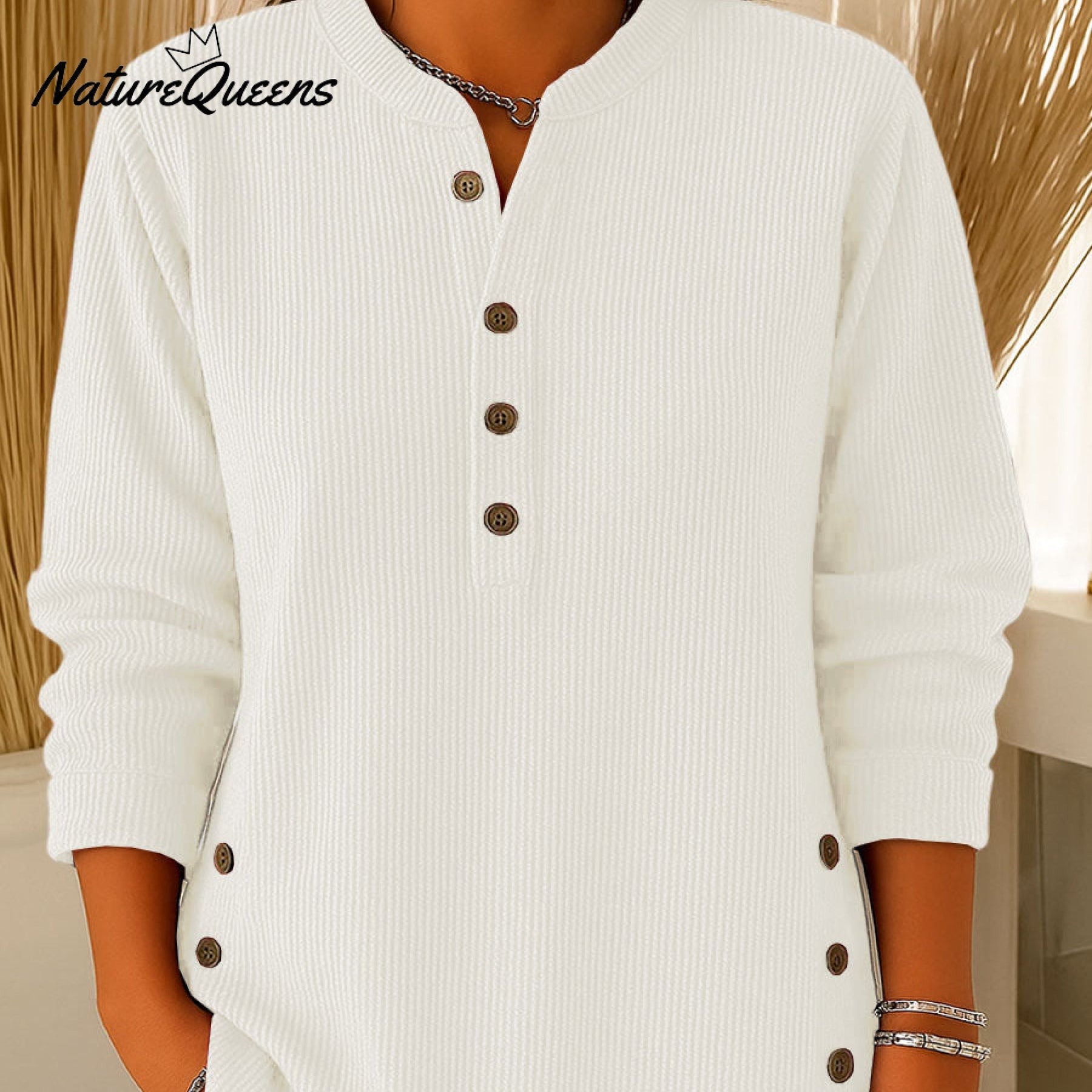 Dekolt z subtelnym zapięciem na guziki dodaje charakteru, a lekko luźny krój sprawia, że bluzka pasuje do każdej figury. Quinty™ to idealny wybór do jeansów, spodni materiałowych lub legginsów — zarówno na co dzień, jak i do pracy.