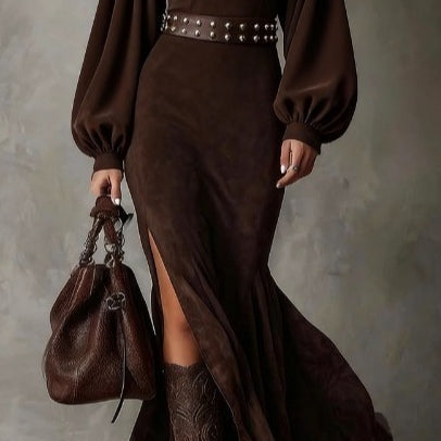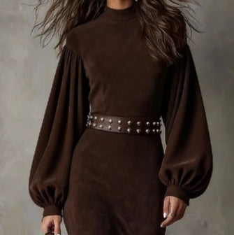Retro długa sukienka z długim rękawem i półwysokim kołnierzem