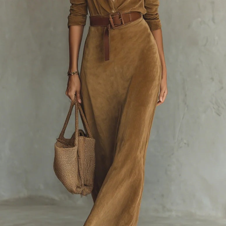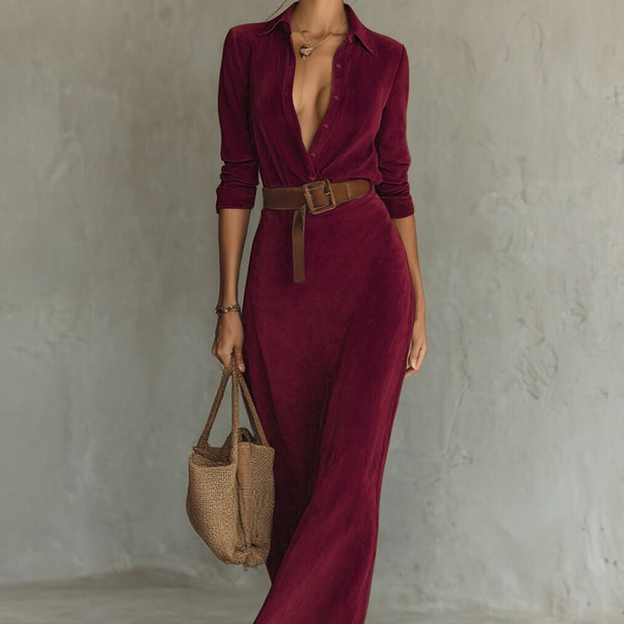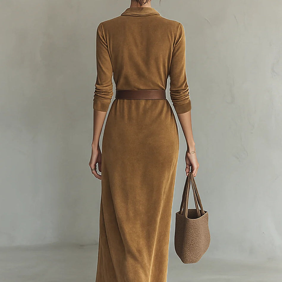 Zamszowa sukienka maxi z pojedynczym zapięciem i kołnierzem
