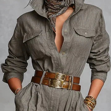 Połączenie oddychającej bawełny i lnu w tym kombinezonie zapewnia komfort i lekkość przez cały dzień. Klasyczny fason z długimi rękawami i kołnierzykiem w stylu koszulowym sprawia, że ​​jest to elegancki wybór zarówno przy codziennym wyjściu, jak i na spotkaniach towarzyskich. Dzięki prostymu, luźnemu krojowi, ten kombinezon idealnie nadaje się do sandałów czy mokasynów, tworząc stylowy i wygodny wygląd.