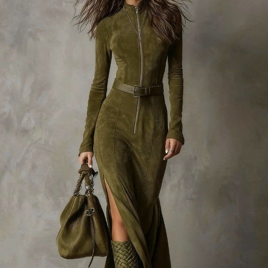 Podnieś swoją garderobę dzięki tej uderzeniowej, która uderzyła maxi, zabezpieczającej z eleganckim zamkiem z przodu, paskami w i zwiewnym rozcięciem. Wykonanie z miękkiego materiału PU zamszowego, łączy vintage'owy urok z dodatkowym stylem. Dopasowany gorset skierowany pod kątem, podczas gdy wysokie rozcięcie dodaje ruch i wdzięk. Idealna zarówno na codzienne wyjścia, jak i na wieczorne imprezy.